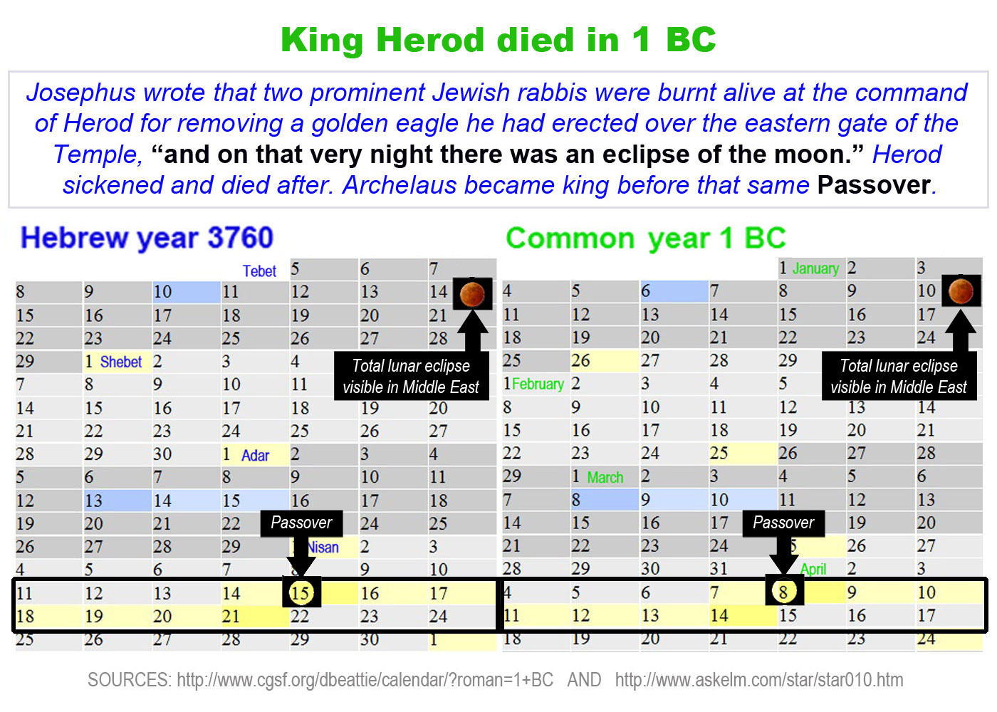 The traditional date given for the death of Herod the Great (4 BC) was based on a very early transcription error that was carried over again and again into later copies of the document. The earliest copy of the actual historical document says he died in 1 BC. This later date is verified by a close analysis of the Jewish calendar, lunar eclipse data from NASA and Josephus’ account of Herod’s death. (There is a detailed account @ “Astronomy and the Death of King Herod” @ http://www.askelm.com/star/star010.htm.)