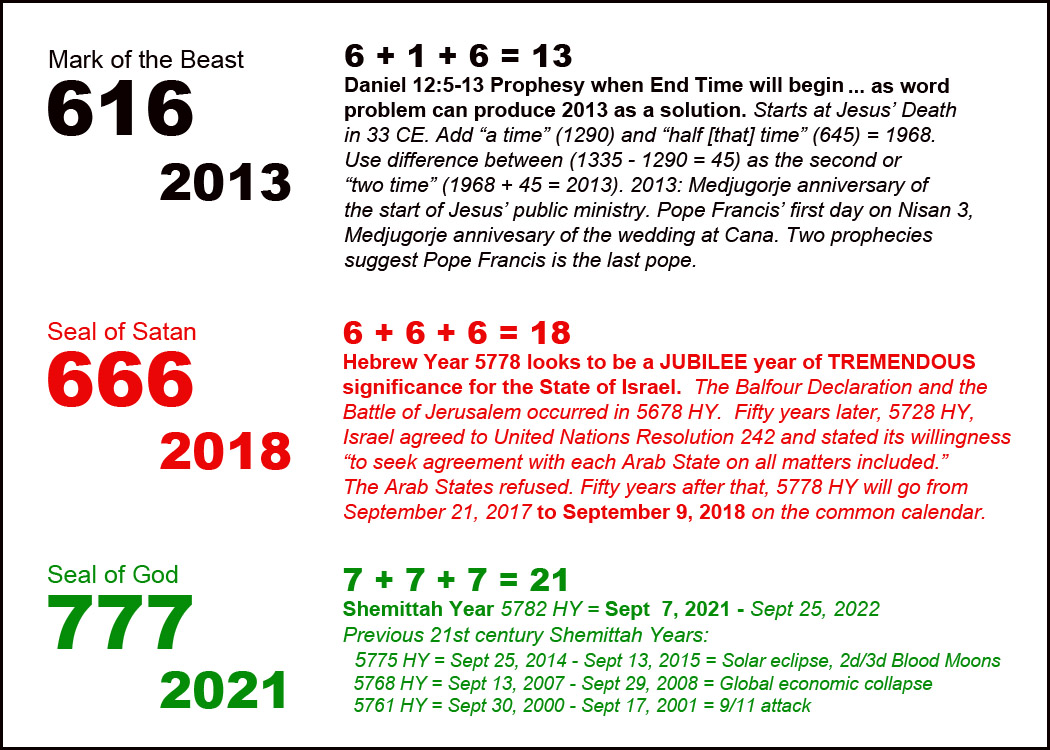 Note: I thought it would be easier to discuss these numbers if 616 and 666 had distinct names, so I assigned the “Seal of Satan” to 666 because it’s related to the Seal of God and “Mark of the Beast” to 616 because it depicts Satan and his two End Times henchmen.