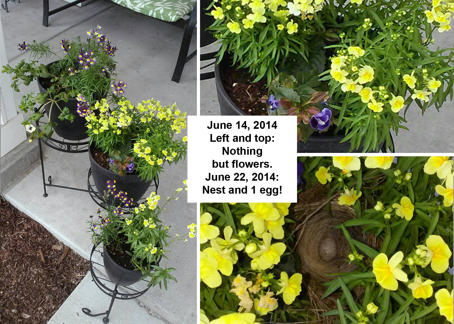 July 4, 2014: I managed to slowly water this pot around the edges so I can get the plants but leave the nest dry. The parents seem to know I am not a predator!
