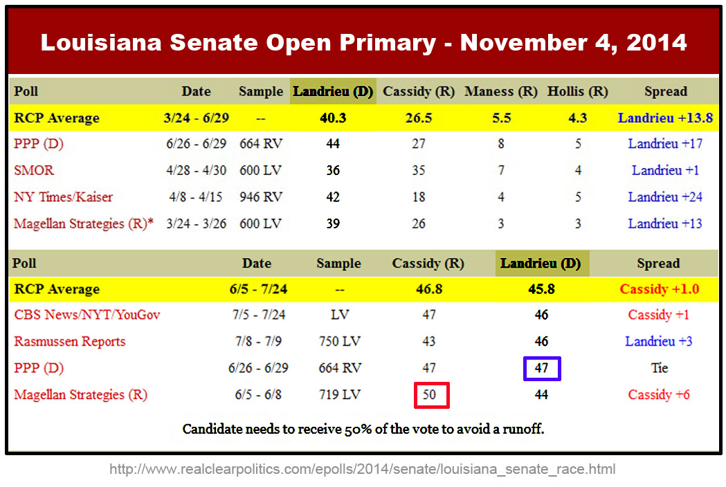 Louisiana’s November 4th election requires at least 50% of the vote go to a single candidate. Barring that outcome, the top two go to a December runoff. Even the most optimistic polls don’t show Landrieu getting to the 50%, outright win mark; only one shows Cassidy at 50% without Manes in the race. Democrats hope Manes will split the GOP vote and give Landrieu a chance at the run-off.