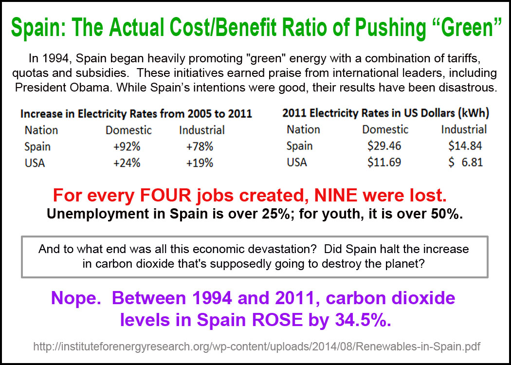 Spain’s aggressive government support for renewable energy caused utility prices to skyrocket. While costs for energy and everything that uses energy rose sharply, jobs disappeared. With more people needing welfare and fewer producers paying taxes, the Spanish government was forced to admit in 2012 that it simply cannot afford to continue subsidizing “green” energy.