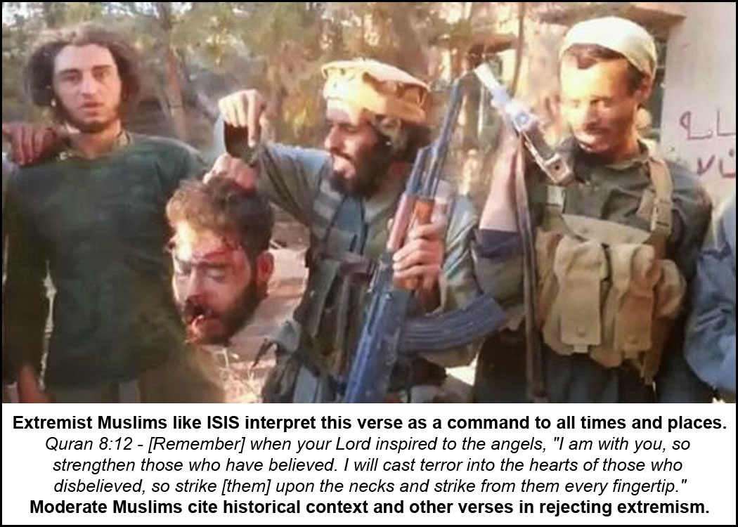 EXCERPT: “Some non-Muslims either through ignorance or Islam-bashing continue taking the verses of the Holy Quran out of context and its history to justify their false propaganda. In order to gain a proper understanding of many verses in the Holy Quran, it is important to understand and know the historic context of the revelations. So many revelations in the Holy Quran came down to provide guidance to Prophet Muhammad (peace be on him) and the fellow Muslims based on what they were confronting at that time. The verse 8:12 is one such verse which is misinterpreted. …
