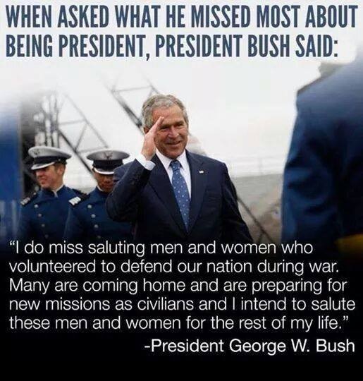 When asked what he missed about being president, George W. Bush replied, “I do miss saluting men and women who volunteered to defend our nation during war. Many are coming home and are preparing for new missions as civilians, and I intend to salute these men and women for the rest of my life.”  Bush’s library is also spearheading a program to help unemployed veterans learn new skills.