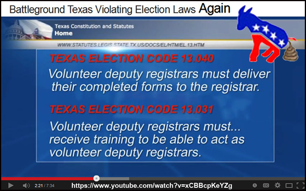 Feb 19, 2014: Battleground Texas volunteers talk about forging signatures on official voting documents (which is voter fraud) and transcribing personal information from voter registration forms (also illegal). This video also reviews a previous Project Veritas exposé in which Obamacare navigators with Enroll America Texas were caught harvesting personal information from enrollees to give to Battleground Texas. James O’Keefe then demonstrates the connection between Battleground Texas and ACORN. [7:10]