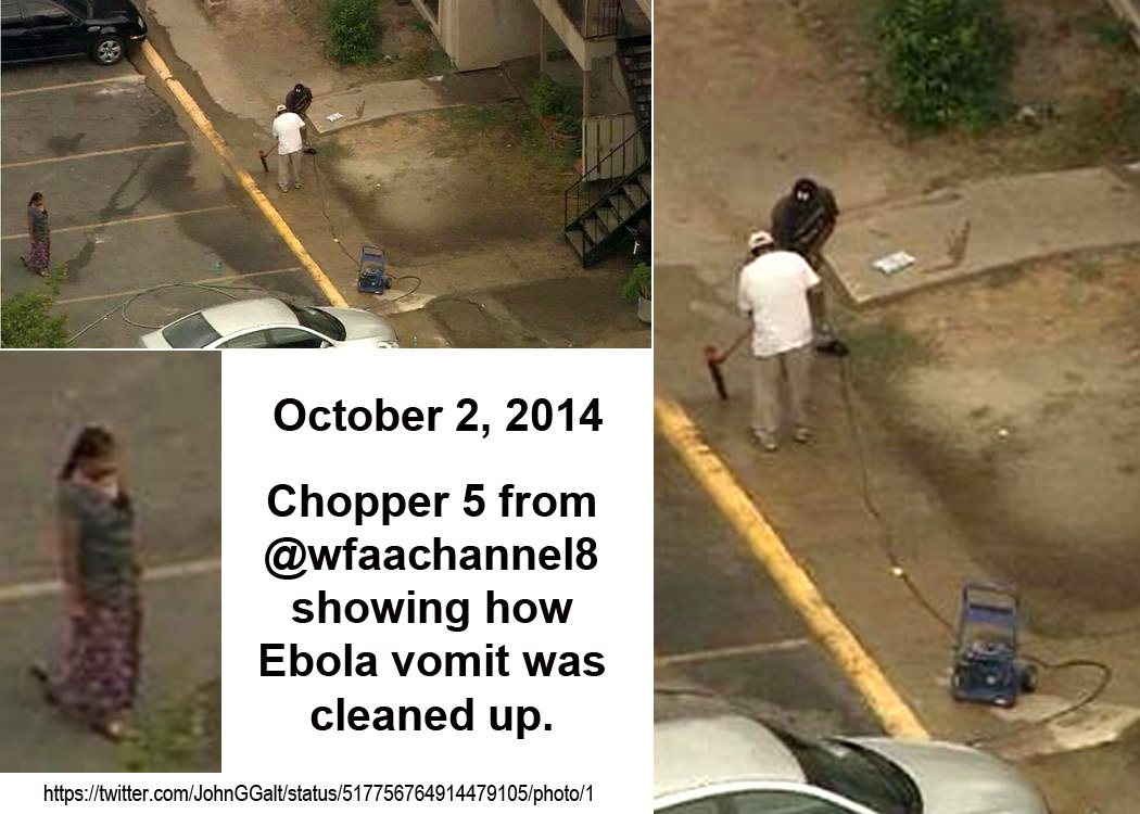 “October 2, 2014: UM, CALL ME CRAZY, BUT cleaning up Ebola vomit with a pressure washer seems like a lousy idea, with droplets blown into air and such. Note the absence of protective gear. Note woman in sandals standing next to runoff. Maybe they’d hosed everything down with bleach first. Somebody please tell me this isn’t as bad as it looks. . . . ”