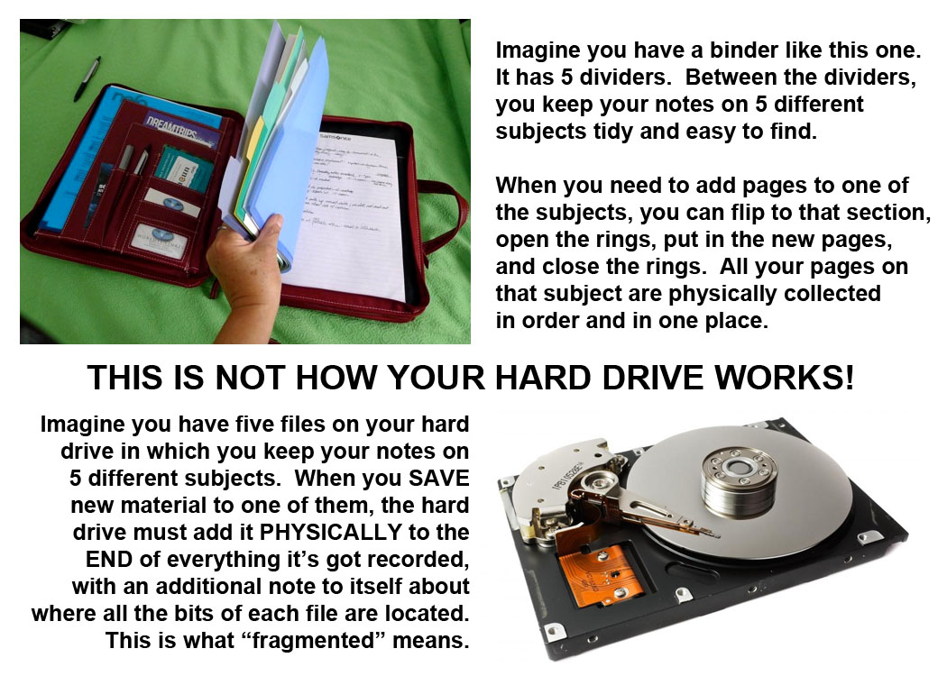 10/29 – I sent this to my puter tech friend and got a huge Atta Girl back today. “This was awesome. This was the best graphic explanation of defragging I’ve ever seen, and I’ve been at this for nearly 30 years.”