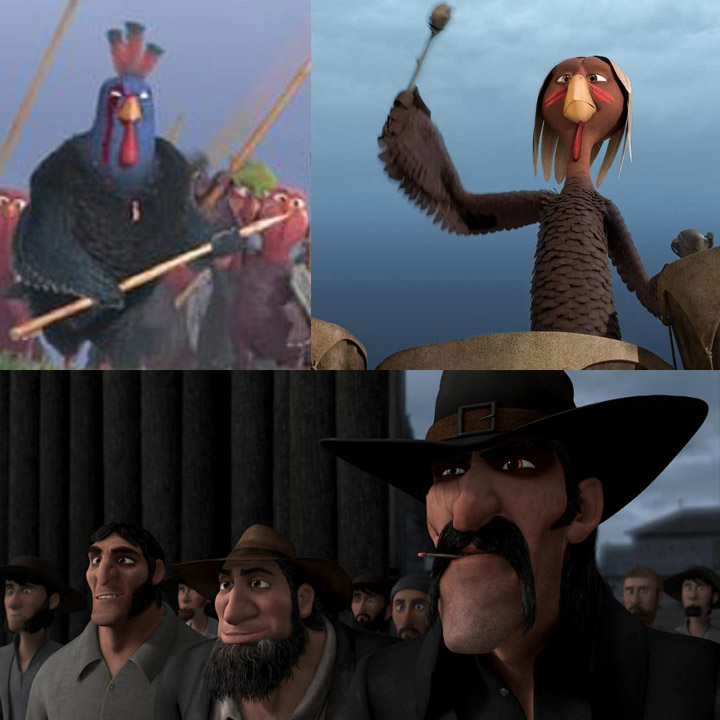 The look of the alleged Pilgrims in Free Birds was more Wild West meets the Legend of Sleepy Hollow than anything. The black horses were very scary and Headless Horsemany, then there was the vicious hunting dog pack of slavering Irish wolf hounds. Funny … I don’t remember horses or wolf hounds on the Mayflower. So add in some Hound of the Baskervilles.