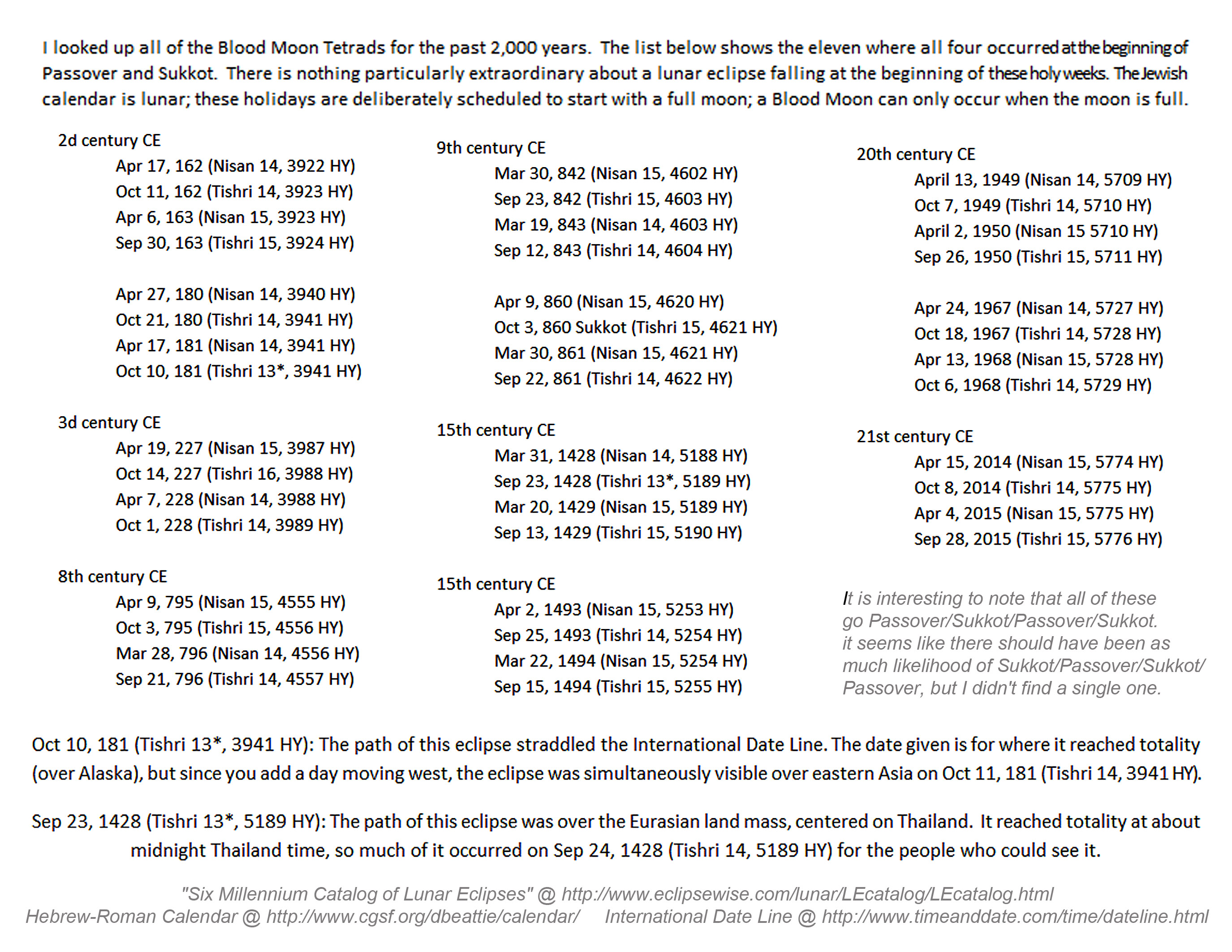 • I lost the two in the 3d and 15th centuries, because while there were total solar eclipse within those tetrads, they didn’t fall on significant dates in the Jewish calendar.  That left me with six tetrads.