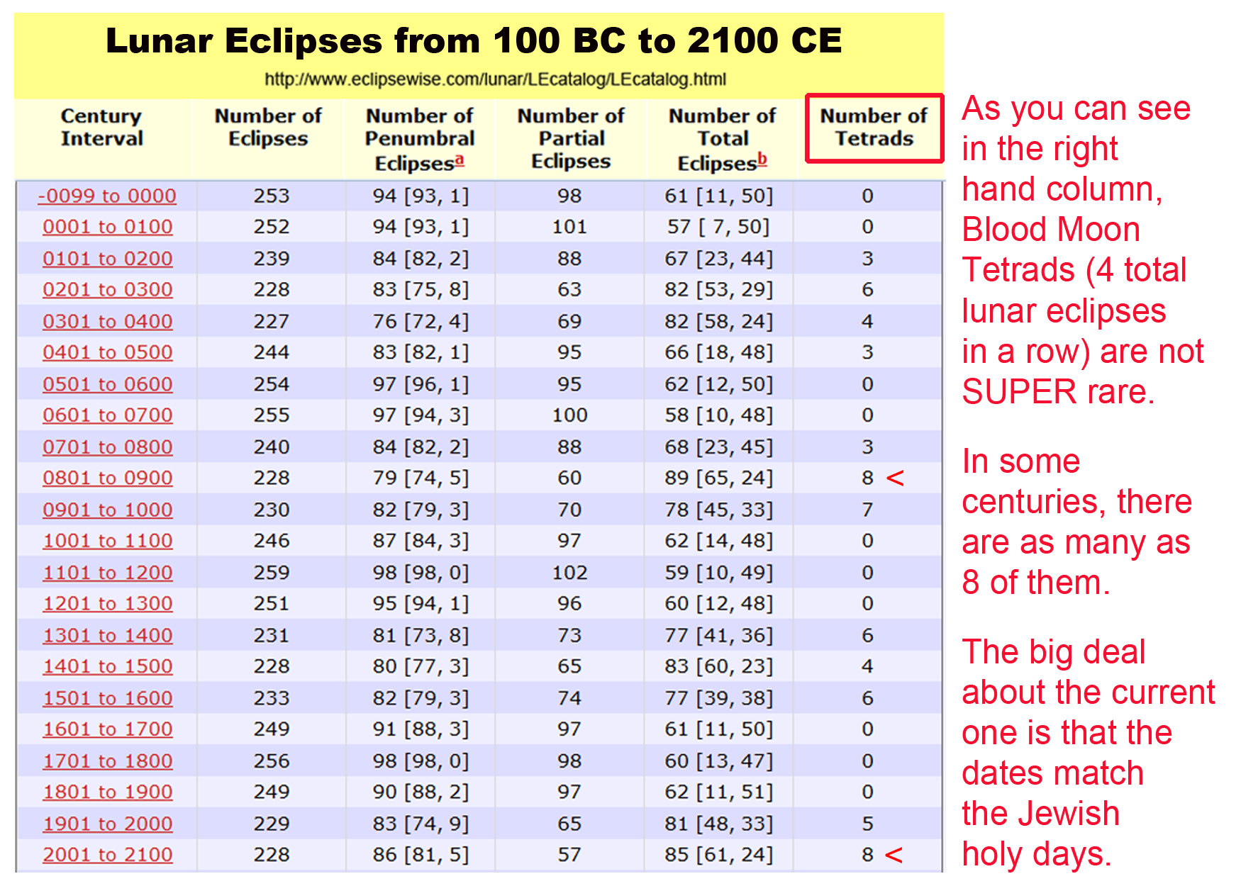 At the NASA website, there is a page called “Six Millennium Catalog of Lunar Eclipses” on which the number of Blood Moon Tetrads per century is given for every century from 3,000 BC to 3,000 CE.  As you can see here, four lunar eclipses in a row are unusual, but nothing like as rare as I’ve heard claimed.
