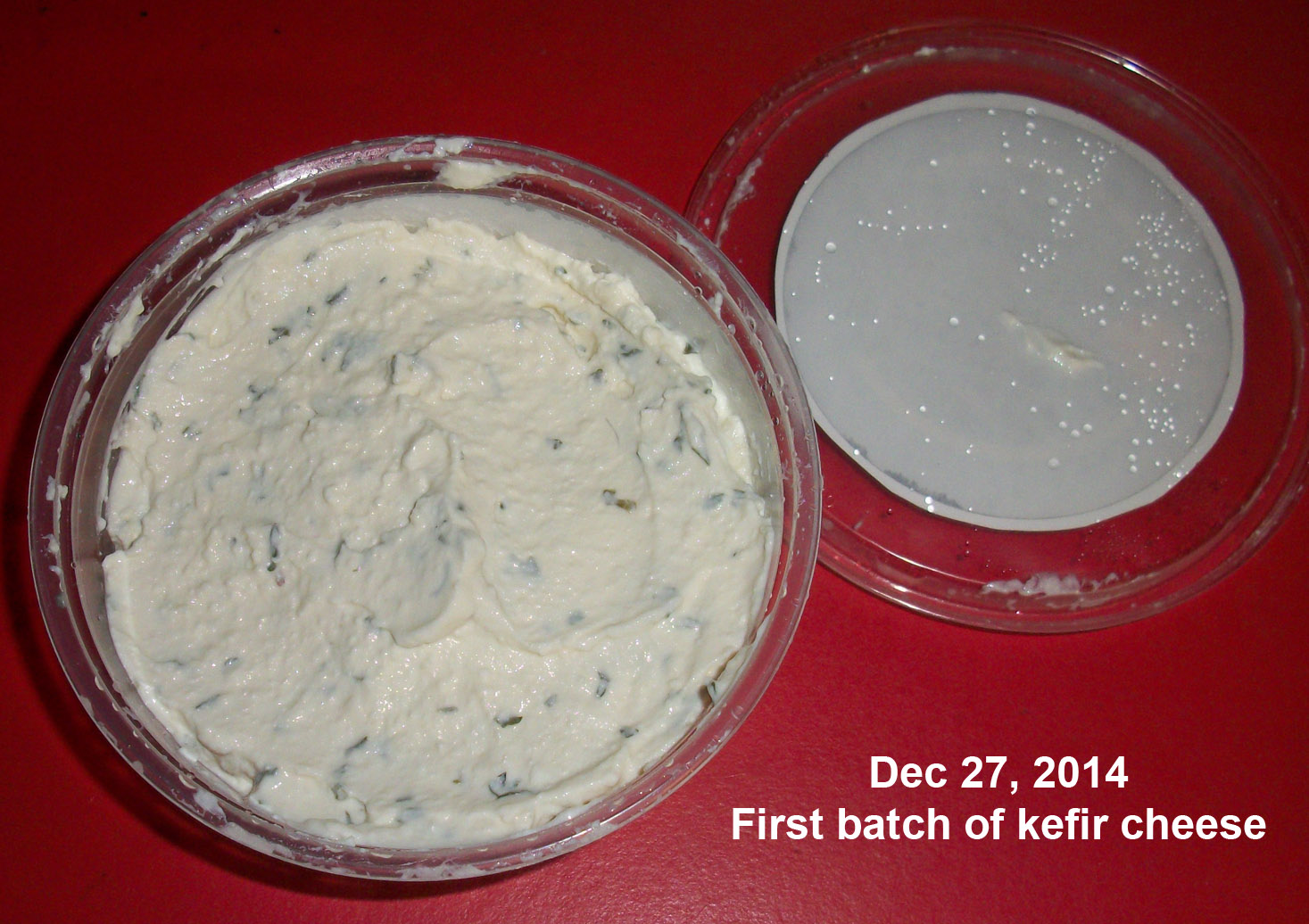 Dec. 27, 2014: First batch of kefir cheese. It would be hard to imagine how this could be any easier! I put parsley in this batch. I’m looking forward to trying other things and seeing if I can make my spreads tasty enough to wean Dearest off some of those expensive brands of hummus he buys for his sammiches. (The white dots on the lid are water droplets.)