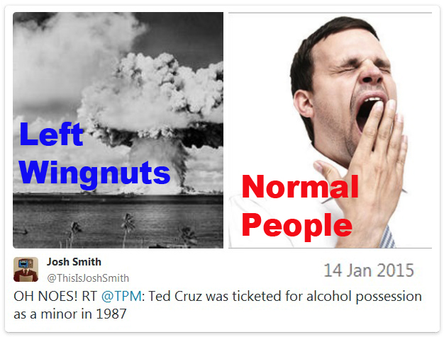 If that’s the best they can come up with, I’m inclined to think Cruz must be pretty squeaky clean. Remember how desperately they tried to dig up dirt on Dan Quayle, and the best they could come up with was his less-than-stellar spelling skills? (And even that was a lie, but let it go.) This is pretty close to being as trivial as that, which is good news for Cruz — at least until they discover an unpaid parking ticket from when he was in college, or maybe an overdue library book from when he was in sixth grade.