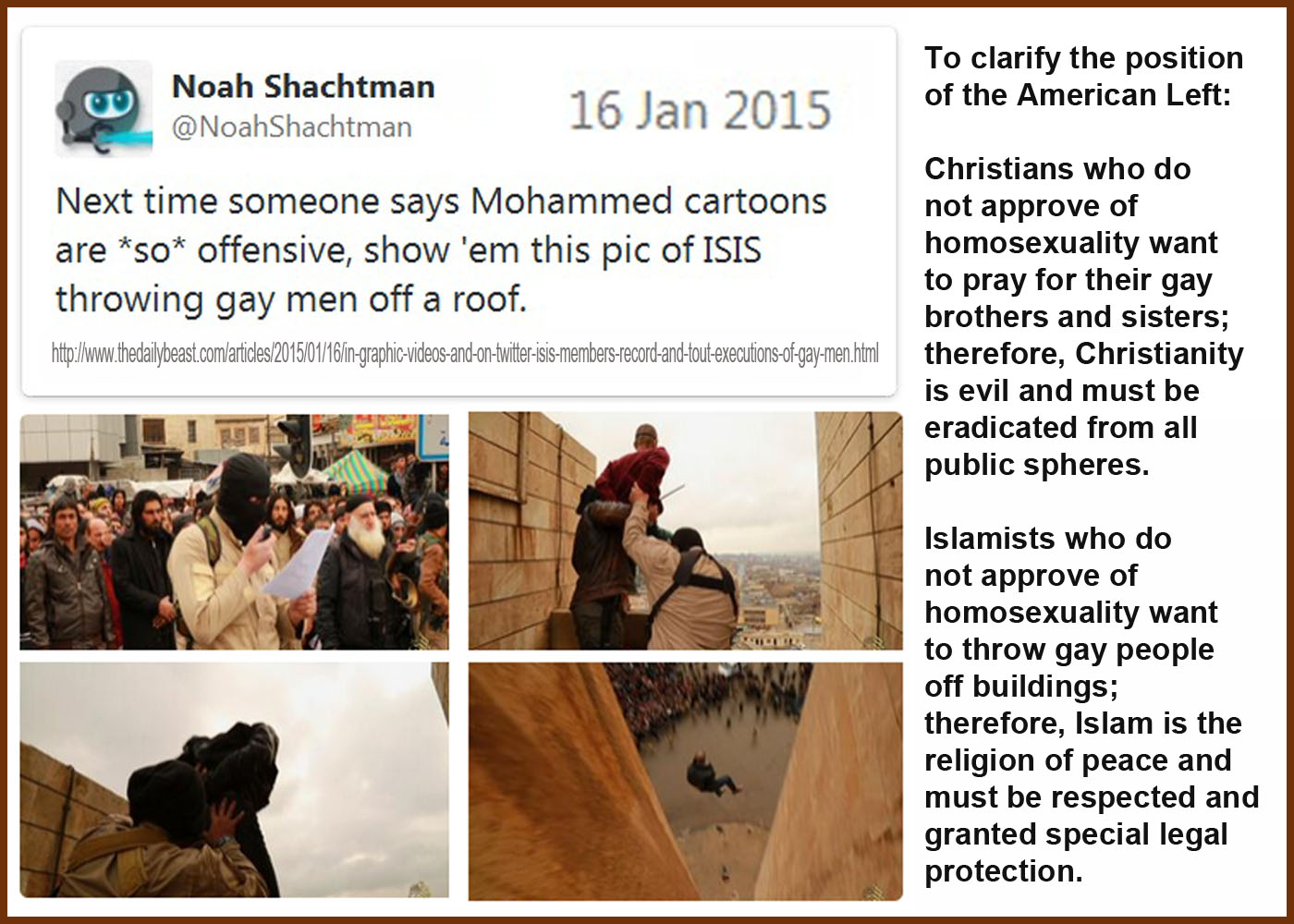 - http://twitchy.com/2015/01/17/religion-of-peace-though-isis-members-shown-throwing-gay-men-from-tall-building-to-their-deaths/