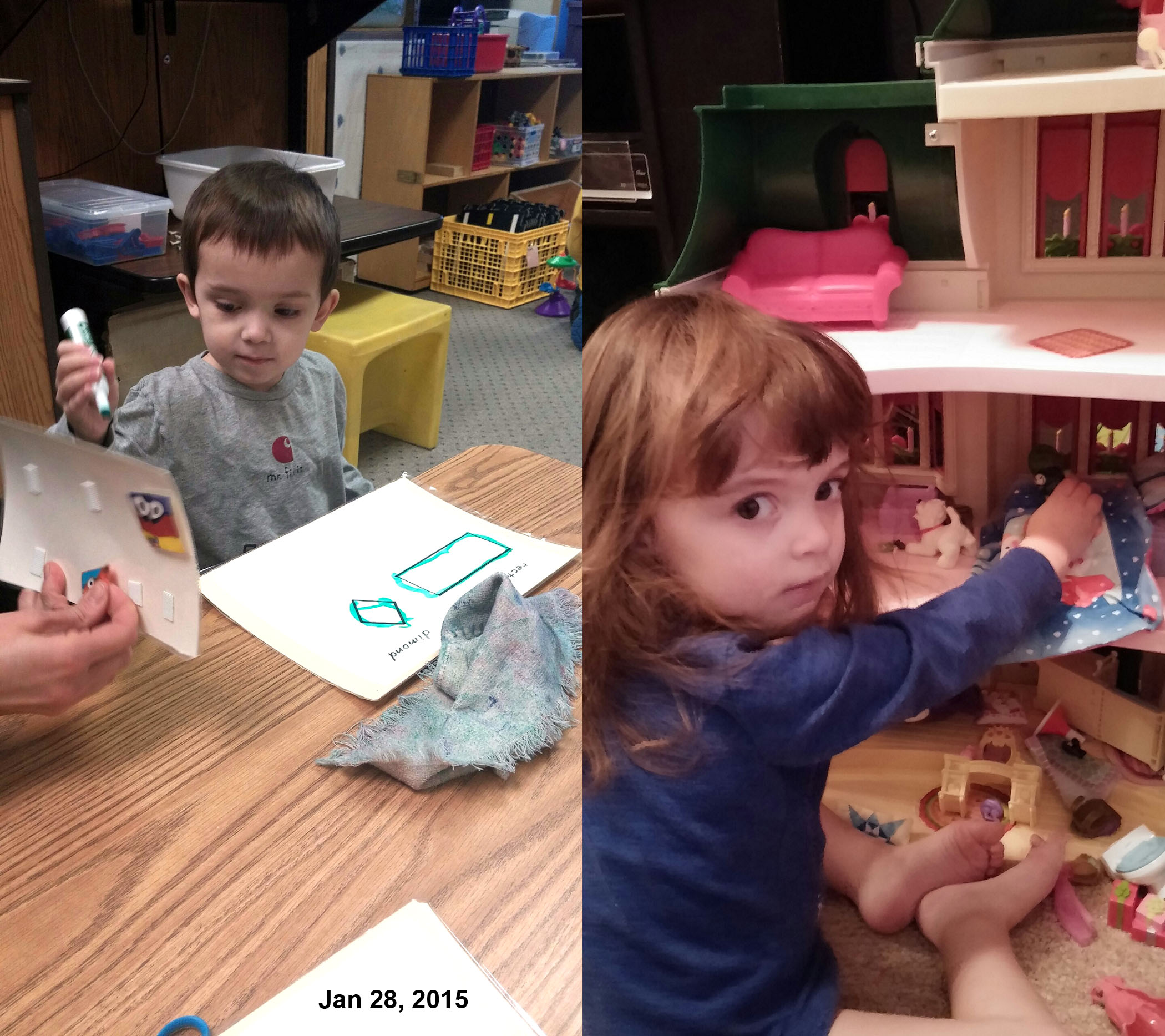 Bunny spends a lot of time doing creative play with the dolls in her doll house. Lil Buzz has been tracing numbers and shapes quite a bit during work sessions at school lately — working on holding marker correctly, as well as controlling movement. Check out his rectangle!
