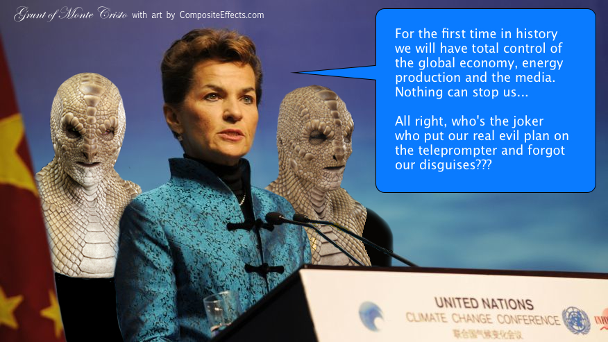 Ummmmmm. Is it just me, of are these guys not even hiding their evil plan for world domination any more? What does any of this really have to do with “climate?” And by the way, I didn’t alter the image of Ms. Figueres in the above graphic in any way. She really did look exactly like that, like Bride of Dr. Evil, as she talked about seizing total control of the World’s economy.