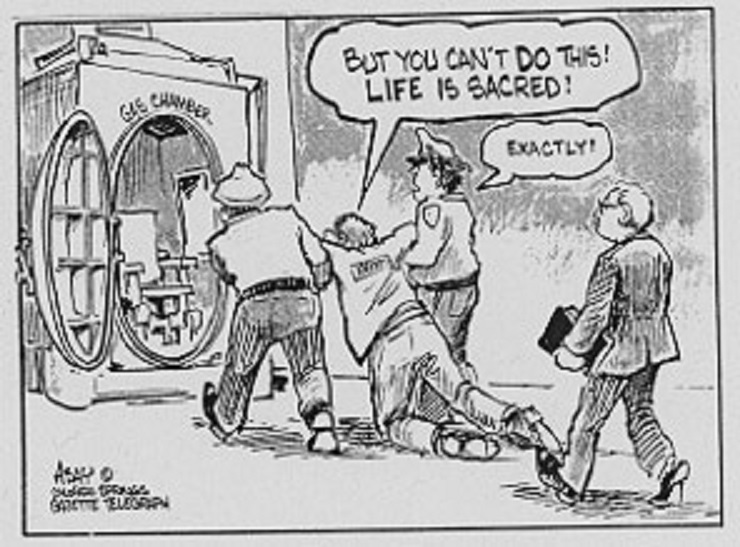 I oppose abortion, assisted suicide, euthanasia and UNJUST war, but I stopped opposing capital punishment in all cases after I heard Dennis Prager speak on it. The compelling point he made for me was that a total ban on a death penalty is tantamount to society saying, “Victims are never as valuable as those who kill them.”