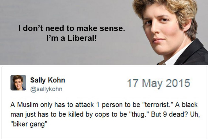 Left-wing apologist Sally Kohn got on Twitter to express her outrage at how everyone was using the term “biker gangs”, not “thugs” or “terrorists.”