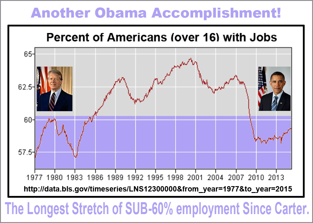 My friend itooktheredpill showed me another of Obama’s “First Since Carter” accomplishments … the longest, lowest employment rate!