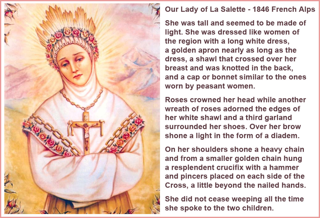 I would love to know more about the La Salette image. I can see “Know Him, Love Him, Serve Him” in the placement of the three garlands of roses on her head, breast and feet. And the cross with implements of torture combines with her weeping. But I had no idea what the people of that time would have made of the heavy gold chain.