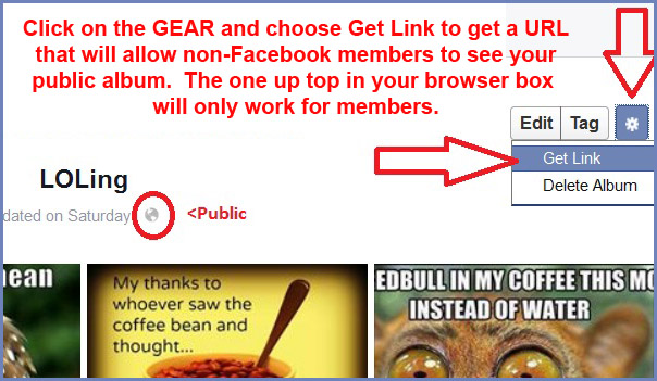 I keep an album called “LOLing” of things that make me giggle. When I am at that page, the URL in the browser box only works for Facebook members who are logged in. It looks like this: