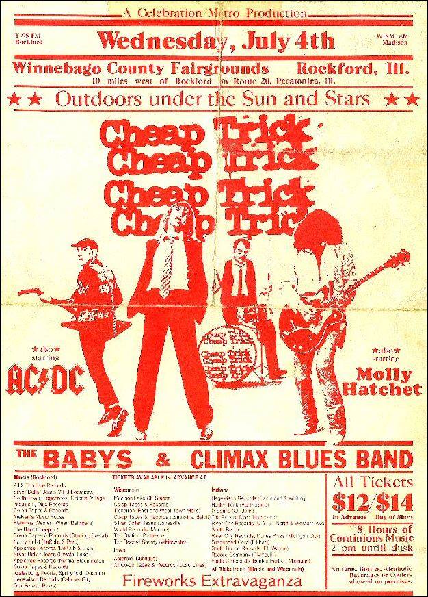 THIS HAD TO BE ABOUT 1974-75. DW WENT TO SCHOOL WITH THE DRUMMER,BUN E. CARLOS (BRAD CARLSON) AND RICK NEILSEN’S DAD RALPH OWNED THE BIGGEST MUSIC STORE IN TOWN. BY THE TIME HE FINISHED HIGH SCHOOL, RICK COULD PLAY MORE THAN 20 INSTRUMENTS AND WAS ALREADY DESIGNING HIS OWN GUITARS, AS HE STILL DOES. I HAD A MUSIC THEORY CLASS WITH HIM AT OUR COMMUNITY COLLEGE. I WORKED MY BUTT OFF FOR A ‘C.’ HE SHOWED UP FOR ABOUT TWO CLASSES AND ACED IT. GO FIGURE. CAN YOU IMAGINE SEEING ALL THESE BANDS FOR TWELVE BUCKS?
