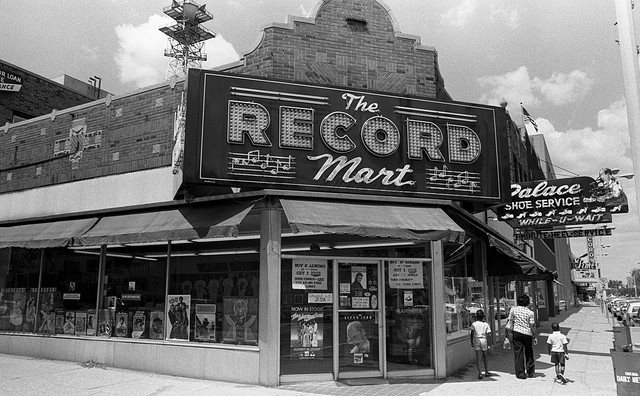 EVERY CHANCE I GOT I HEADED FOR THE RECORD STORE TO BUY THE LATEST 45s FOR 1.49. IN THE PICTURE YOU CAN SEE THE PALACE SHOE REPAIR. OUR FIRST DRUMMER WAS THE NEPHEW OF THE OWNER. HE WORKED SATURDAYS SHINING SHOES. THE GUITAR PLAYER,BASS PLAYER AND I WOULD GO IN AND MAKE HIM SHINE OUR SHOES FOR FIFTY CENTS. HE GOT EVEN BY STOPPING PLAYING IN THE MIDDLE OF A SONG. IT WAS WORTH IT.