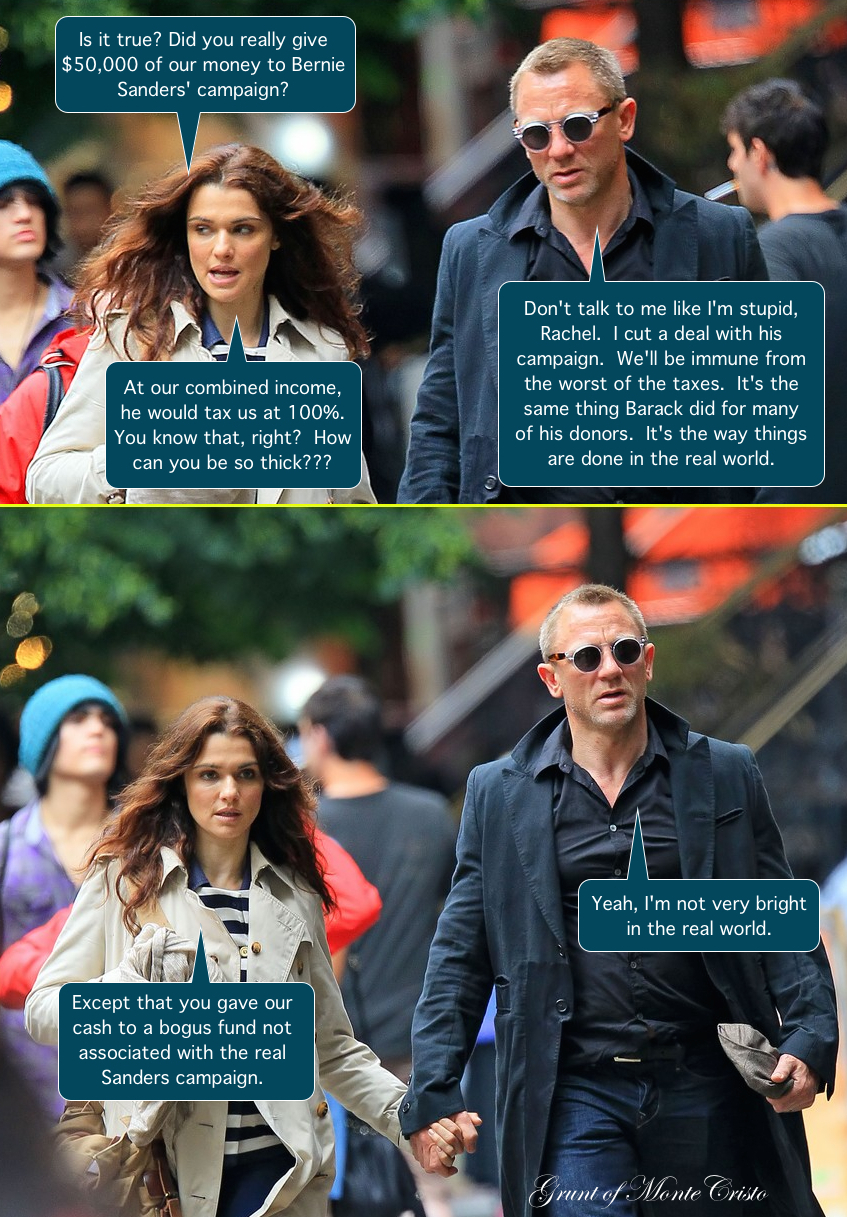 For the backstory on Daniel Craig’s embarrassing twist on a contribution to Bernie Sanders, go to Breitbart. His wife is Rachel Weisz (pronounced ‘vice’), and she has a more established acting career, in addition to being brighter in the real world, than her husband. Even though Jane Dough has never heard of her. 😉