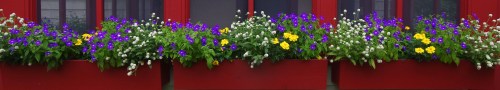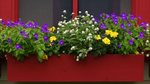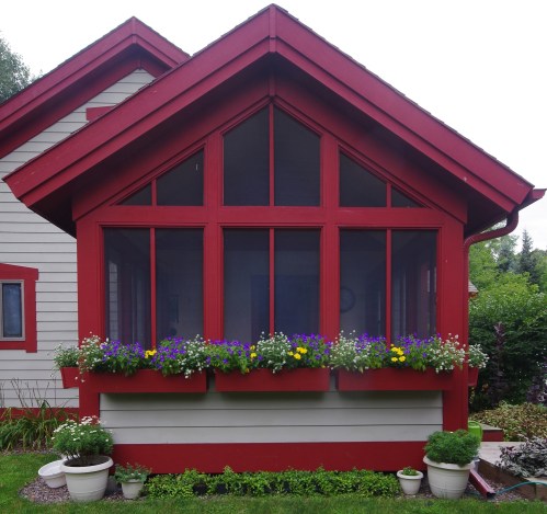 These are the window boxes that surround the screen porch on the east side of my house. There are eight of them, and each one holds five flower pots, so it takes a lot of plants to fill them up. This year I filled them with browallia, marigolds, and globe amaranth.
