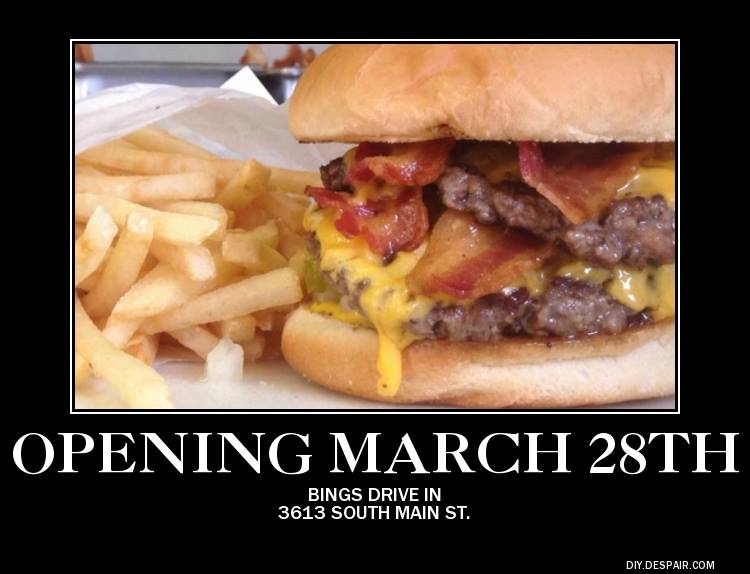 BING’S IS AN INSTITUTION HERE IN TOWN.IT IS THE LAST SURVIVING GENUINE DRIVE-IN RESTAURANT WITH CARHOPS AND WINDOW TRAYS.IF THE WEATHER EVER WARMS UP (and it quits freaking snowing!) I PLAN TO TAKE THE GRANDKIDS THERE SO THEY CAN SEE WHAT A FUN TIME YOU CAN HAVE EATING IN THE CAR.
