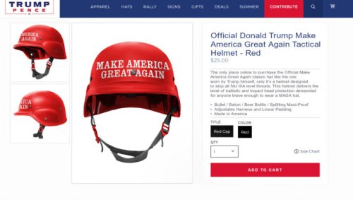 “Want to go to the store in your MAGA hat, but afraid of being assaulted, having water thrown on you, or getting smacked with a baseball bat?” Trump says in a promo video on the website. “The MAGA helmet is for you. I’ve gotta say, I’ve seen lots of tactical helmets in my day. This one’s the best. Tremendous stuff.”
