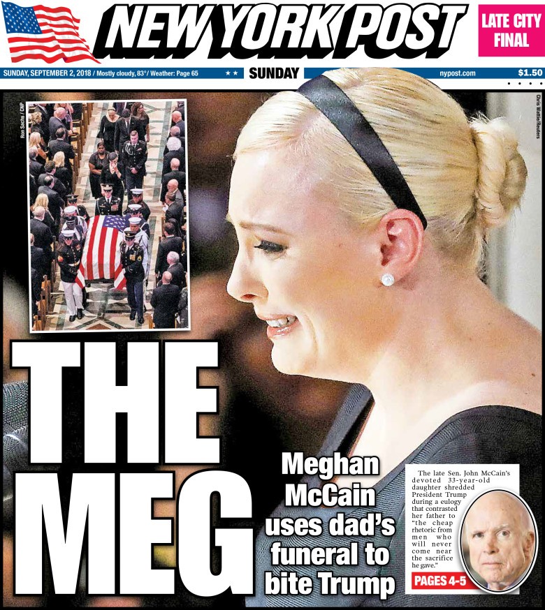 The New York Post cover is just one part of a brewing backlash against McCain and the overall funeral service for Sen. John McCain (R-AZ), which turned into an unseemly partisan rally Saturday with speakers like former Presidents Barack Obama and even George W. Bush trashing President Trump, who Sen. McCain refused to invite to his own funeral.