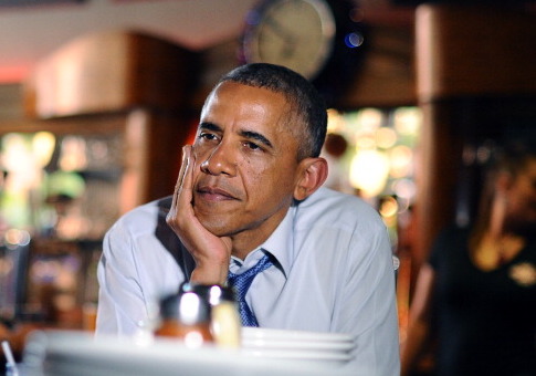 US President Barack Obama listens to a group of people, who wrote letters to him, as he sits to dine with them at a restaurant in Denver, Colorado, on July 8, 2014. AFP PHOTO/Jewel Samad (Photo credit should read JEWEL SAMAD/AFP/Getty Images)