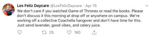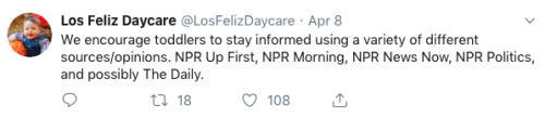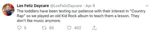Los Feliz Daycare (motto: “We do not accept immunized children”) is an ultra-progressive child care center in an unspecified affluent neighborhood on the left coast. Some recent tweets: