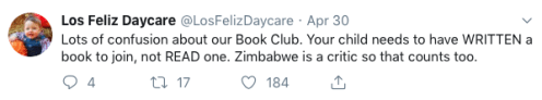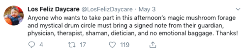 Los Feliz Daycare (motto: “We do not accept immunized children”) is an ultra-progressive child care center in an unspecified affluent neighborhood on the left coast. Some recent tweets: