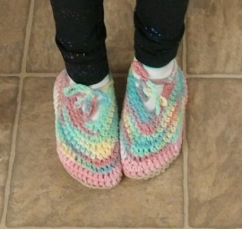 GRAMMY NOTES: I still consider myself a beginner at crochet, though I think maybe I can add “advanced” to that now. One of my dds asked for slippers for her kids and sent me tracings of their feet with measurements of heel height, distance from leg to toe, and distance across the arch (floor to floor). She noted they would enjoy having them made “crazy” so to feel free using left-overs.