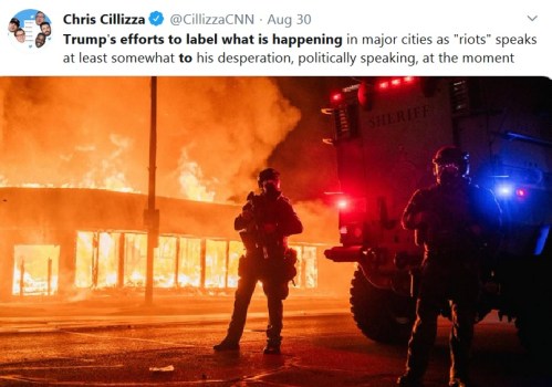 NOT THE BABYLON BEE: I searched Twitter and found the original of this tweet. This is NOT a photoshop. The burning photo is what Chris Cillizza (CNN Editor-at-large) actually included with that message and it is the photo that illustrates the linked article. Un-freaking-believable.
