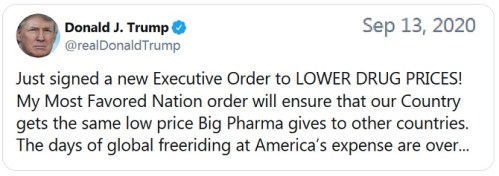 BIG PHARMA: If you see your prescription prices go down, you can thank (and vote for) President Trump. In addition to the Most Favored Nation change, Trump also ended a “shadowy system of kickbacks by middlemen.”