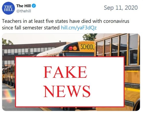 FAKE NEWS: The headline suggests that teaching children in person poses a deadly threat to teachers. The problem is that the teachers featured in the article did not get sick while teaching.