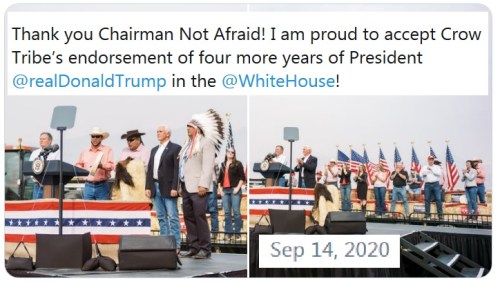 CROW TRIBE: “The Crow Tribe has gone and endorsed Donald Trump for president, a slap in the face to full-blooded Native American Elizabeth Warren, who is a staunch Biden supporter and was certainly hoping her native brothers and sisters would join her and support him as well. You hate to see it. How could they do her like that? Their own flesh and blood?” – Doc Holliday at Not The Bee