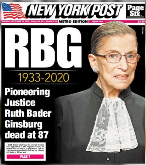 GINSBURG: RIP – Supreme Court Justice Ruth Bader Ginsburg (87), the second-ever woman appointed to the high court, died Friday night at her home in Washington, D.C., due to complications of metastatic pancreas cancer.