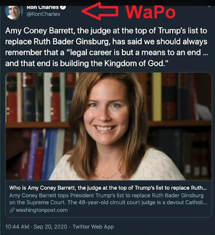 BARRETT: The Washington Post reports that Amy Coney Barrett has a record of evil, heinous actions, like arguing for better due process in college sexual assault allegations. She is also … oh noes … an actual Catholic who doesn’t just talk about, but actually lives her faith.