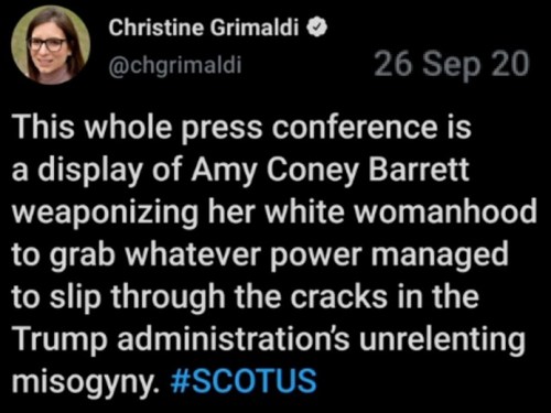 And Christine Grimaldi was just furious that ACB brought her husband and children to the White House for Trump’s announcement. According to her, “Trump and Barrett using her black children and child with Down Syndrome to score political points” was “appalling.”