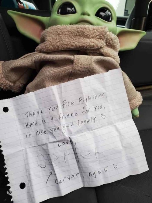 FIREFIGHTER: Last month, 5-year-old Carver from Oregon sent a Baby Yoda doll to firefighters. Baby Yoda has made the rounds from fire to fire in multiple states – including Oregon, Wyoming, Montana, Colorado, Idaho, and Utah – giving moral support to firefighters on the front lines. A Facebook page called “Baby Yoda fights fires” has tracked his journeys.