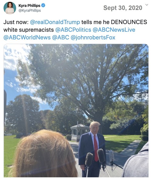 CONTRIVED: Sept 30th tweet above by ABC’s Kyra Phillips, who is engaged to to Fox News’ John Roberts – CLICK https://twitter.com/TimRunsHisMouth/status/1311721584089067521 [1:58] to hear Kayleigh McEnany slap down Fox News’ jerknalist John Roberts on October 1st.