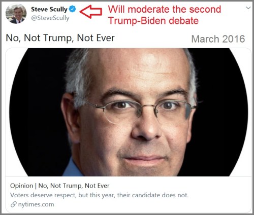 DEBATE: Slow Joe will have another babysitter – C-SPAN’’s Steve Scully – moderating the second debate on Oct. 15. Not only did Scully once worked as an intern for then-Sen. Joe Biden, but in March, 2016, he retweeted an Op Ed in the New York Slime entitled “No, Not Trump, Not Ever.”