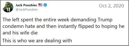 COVID-19: Among the nasties hoping the Trumps die is Zara Rahim (Hillary’s 2016 national campaign spokeswoman), Zach Graumann (Andrew Yang’s campaign manager), MSNBC’s Joy Reid, and actor John Cusack. Keep this in mind the next time someone on the Left says Trump lacks the necessary empathy to be president.