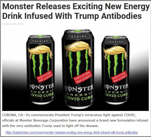 - https://babylonbee.com/news/monster-releases-exciting-new-energy-drink-infused-with-trump-antibodies