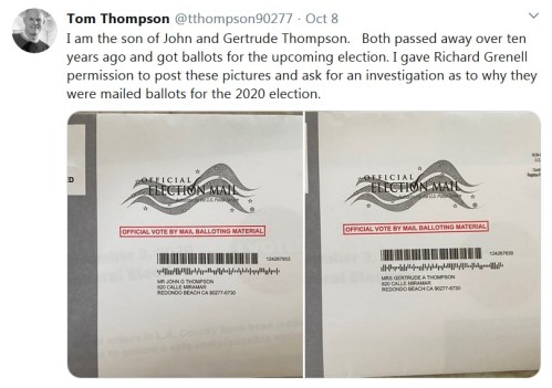 CALIFORNIA: Voter fraud – Two people who have both been dead for more than a decade received unsolicited ballots in California’s “screw the vote” scheme.