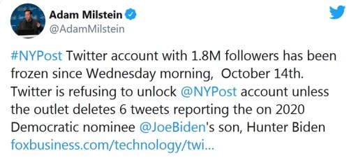 Twitter promptly locked the Post out of its own Twitter account and blocked tweeters from sharing a link to the story on the Post’s web site. Twitter got considerable blow back and unblocked the story, but is still locking the Post out of its Twitter account with demands it delete tweets of its own reporting of the story that Twitter claims is no longer being blocked.