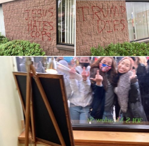 After said thugs danced off to celebrate their “win over fascism”, the little group of Republicans took their signs back outside. They said they got a lot of honks and thumbs ups from commuters who drove by during rush hour.