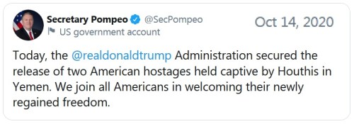 YEMEN: The two Americans, Sandra Loli and Mikael Gidada, and the remains of a third, Bilal Fateen, were released in exchange for the return of about 250 of the Iranian-backed Houthi rebels from Oman. Loli had been held by the Houthis for about three years and Gidada was held captive for about a year. Fateen died in captivity.